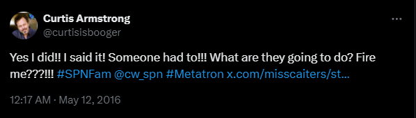 A note to end on: some of the real life drama surrounding Supernatural remains, to this day, some of the funniest shit I’ve ever seen. I will never forgot Jared Padalecki’s insane tweets or the J2 divorce. The show sucked, but Misha Collins getting lost in the sauce at a convention and implying he’s bisexual then having to go on record later and come out as straight? That’s evergreen.